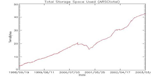 Since 1993, ARSC has had a Cray PVP machine running DMF, with DMF migrating files to tape. We've always kept 2 copies on separate media so as to guard against a tape failure. Tape media we've used over the years include 3480, Redwood, 9840 and 9940. Figure 1 shows total data growth at ARSC since 1998.