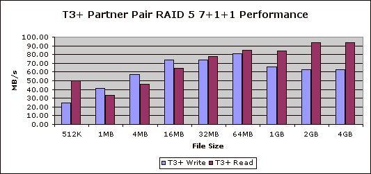 We've only performed limited testing on the Sun T3+ disk so far. Figure 10 shows write performance on a single controller using RAID 5 in a 7+1+1 configuration. The 512K file used a 512K block, all others used a 1MB block. Write bandwidth ranged up to just over 80MB/s. Reads went on the high end, topping out at just over 90MB/s.