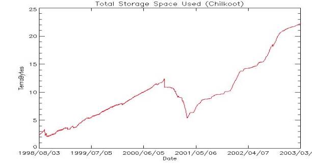 The growth history of chilkoot between 1998 and mid-2000 was dominated by the T3E data. Once the T3E began its own tape service, the growth on what was by then an SV1 became spikier, with the periods of faster growth correlating to activity by our largest vector user.