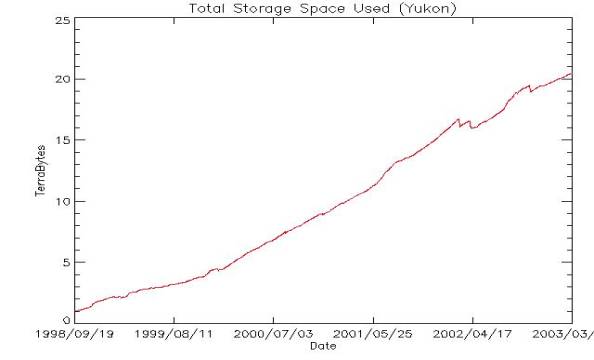 After acquiring a Cray T3E in 1997, we began DMF service on that machine. The initial migration media was using FTP over a dedicated HIPPI link to the Cray J90 (chilkoot). Eventually the volume of data on the T3E (yukon) became so great we decided to attach tape drives directly. The big dip in the total growth (figure 1) and SV1 growth (figure 2) starting in September of 2000, was when we moved the data the SV1 was storing for the T3E to the T3E.