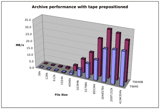 Figure 5 shows the write performance of T9840 and T9940B. The T9840 tops out at about 24MB/s, the T9940B approaches 35MB/s for write. The T9940 performance dropped off some beyond a 1 GB file. This is in part due to the tape changing directions for recording. It was also affected by another process on the system working at intervals on the same RAID array. This test used random data and excludes mount and positioning time.