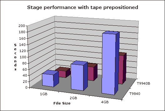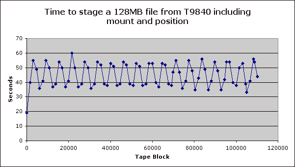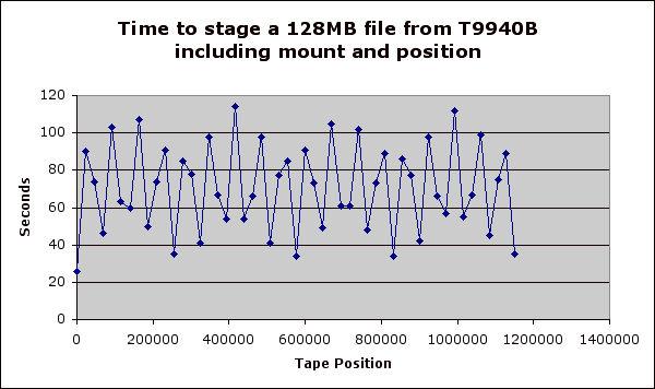 Figures 8 & 9 show time to stage a 128MB file from the two media types including mount and tape positioning. Depending on tape position, stages from T9840 take between 20 and 60 seconds. Stages from T9940B take between 25 and 115 seconds.