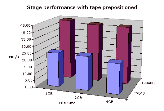 Figures 6 & 7 show read performance on large files, again assuming mounted and positioned tape. Figure 6 shows the time to read files. A 1 GB file stage took about 20 seconds on T9940B, almost 40 seconds on T9840. Depending on where the file is located on tape, somewhere in the 1 to 2 GB file size is where T9940 starts to outperform T9840, including mount and positioning. Figure 7 shows read performance on T9840 is between 20 and 25MB/s, while T9940B is between 42 and 44MB/s.